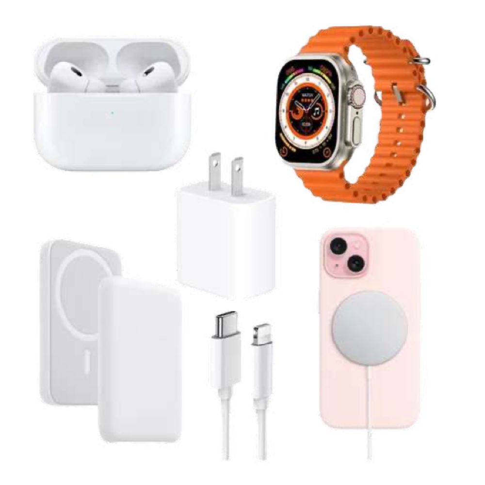 Kit iPhone premium: AirPods Pro 2 + Cubo 20W + Cable Tipo C + Pila MagSafe + Apple Watch Ultra + MagSafe, todo listo para vender.